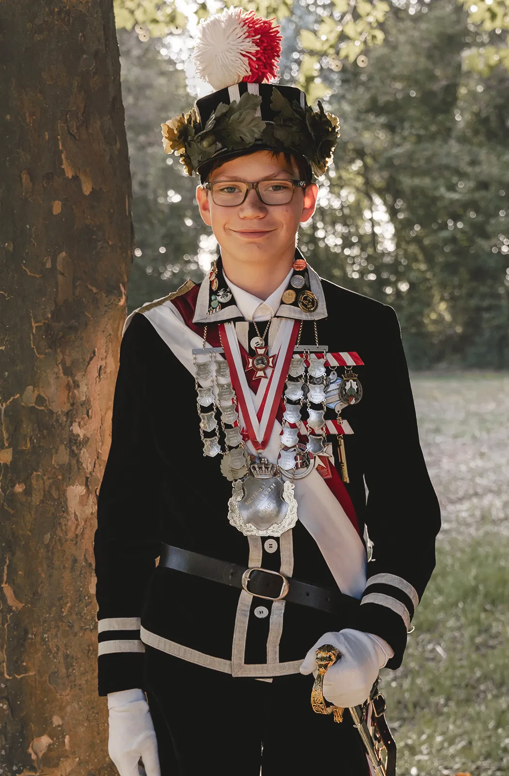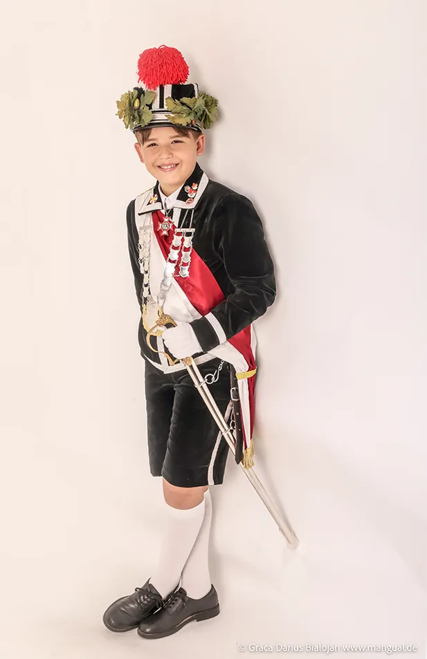 Sie haben allen Zeitenwandel überlebt, unsere Edelknaben, ihre schlichten Knabentracht, schwarz mit silbernen Tressen, weiße Strümpfe – die einzigen im ganzen Regiment* – schwarze Schuhe, ist geblieben. Nur den Holzsäbel haben sie gegen ein wertvolleres Exemplar ausgetauscht. Unter der schicken Mütze mit der Plümm werden natürlich auch schon mal andere Gedanken ausgeheckt als nur dienstlich-schützenfestliche. Aber wer König wird, der trägt die Kette mit nicht geringerer Würde als der große Kollege. Und wenn, das ist nicht zum Lachen, einer mal nicht König wird, dann kann man knabenhafte Zornesausbrüche erleben. Und wenn es einer wird und auf dem Podium hochgereicht wird, dann wischen Muttis verstohlen die Tränen ab und Vatis schnäuzen sich gerührt ins Sacktuch. Auch das ist ein Stück Neusser Leben….